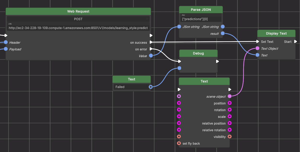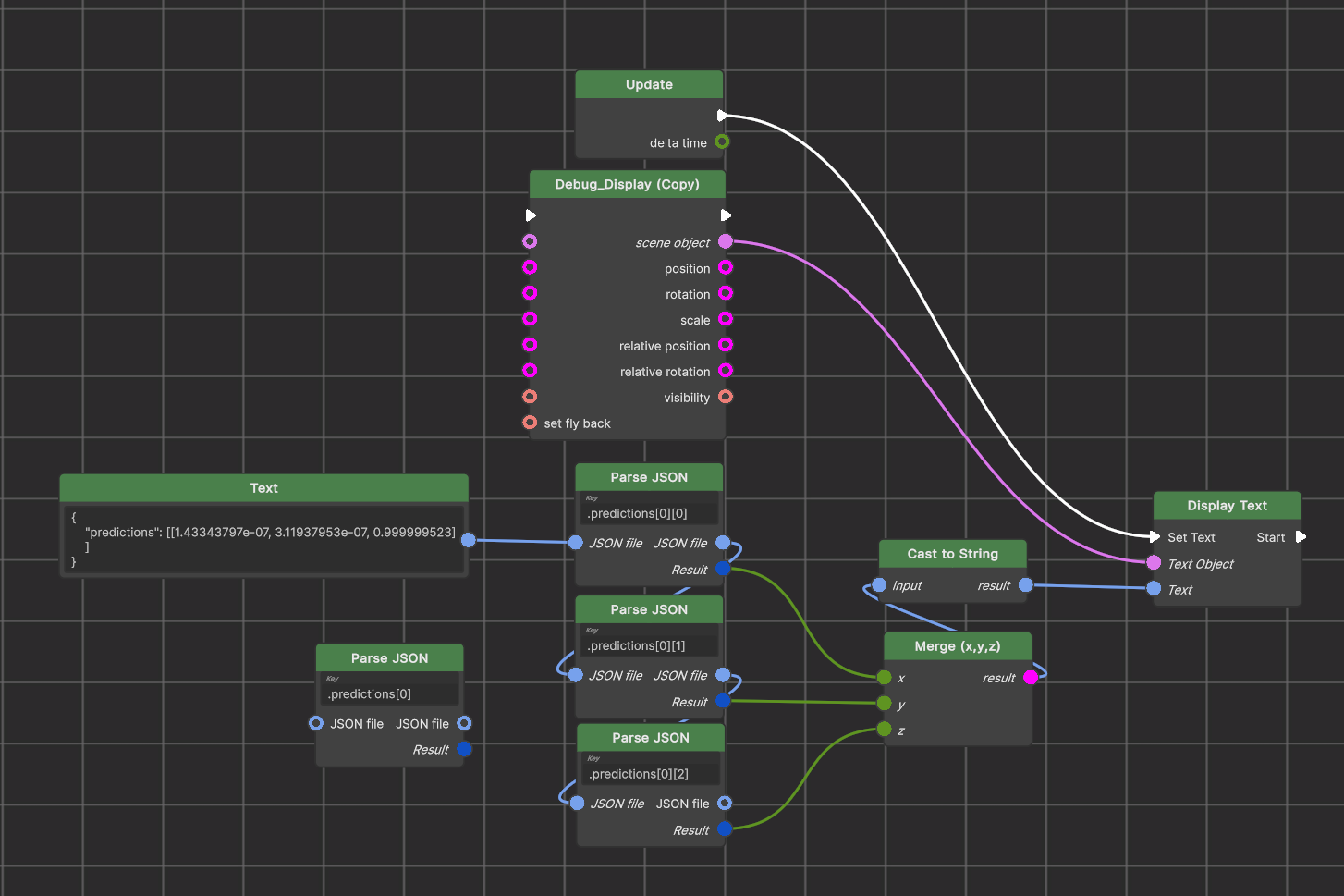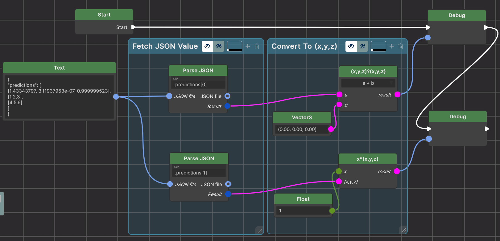because the Debug input type is text. In this demo the Parse JSON nodes are connected to identity operations (+0 or *1) to force the Result to be of the required (x,y,z) type, but in practice you will probably connect the Result output to something that works with the correct type which you want to operate with and thus needs no forced conversion.
