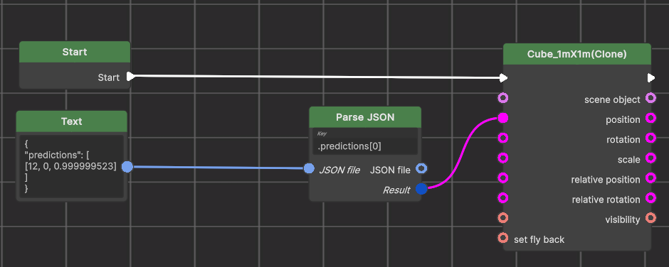 The output of the JSON file can be interpreted as anything, in this case as a Vector3. The cast is implicit because the input of the Cube is a Vector3. You can use an explicit CastVector3 node, but in most cases you won’t need that.